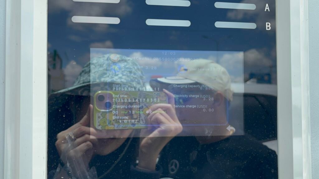 A full 100% charge can take us more than 400 km if we drive at a moderate speed (80–90 km/h). We left Phnom Penh and made our first stop at Phsar Samaki Krakor, where there’s a 120 kWh EV charging station. We spent about $3.28 to charge from 69% to 85% in just 12 minutes, and during that time, we ordered coffee and took a toilet break.